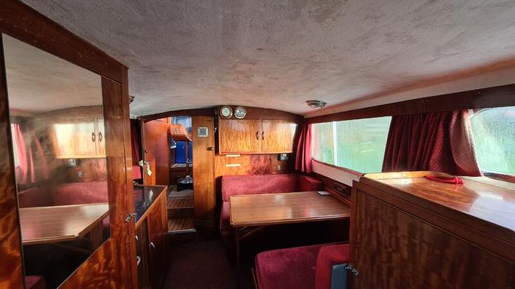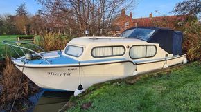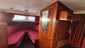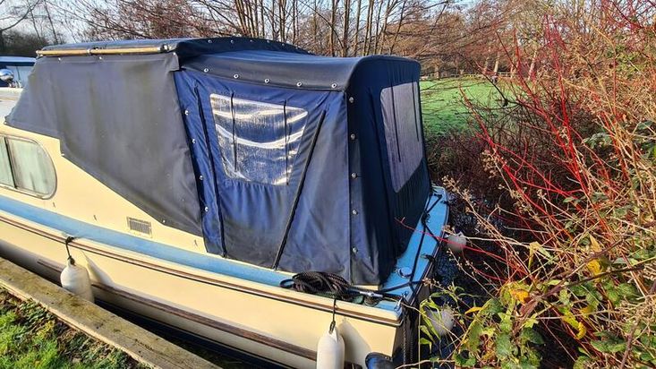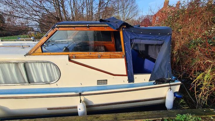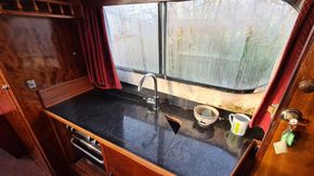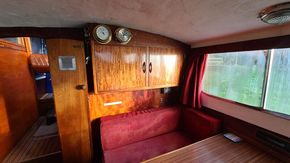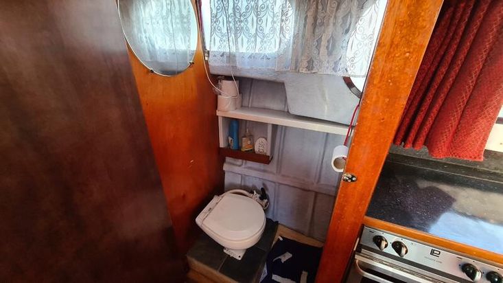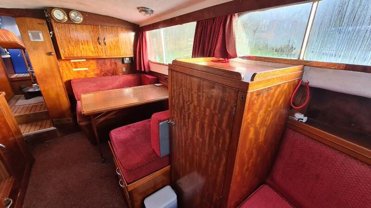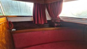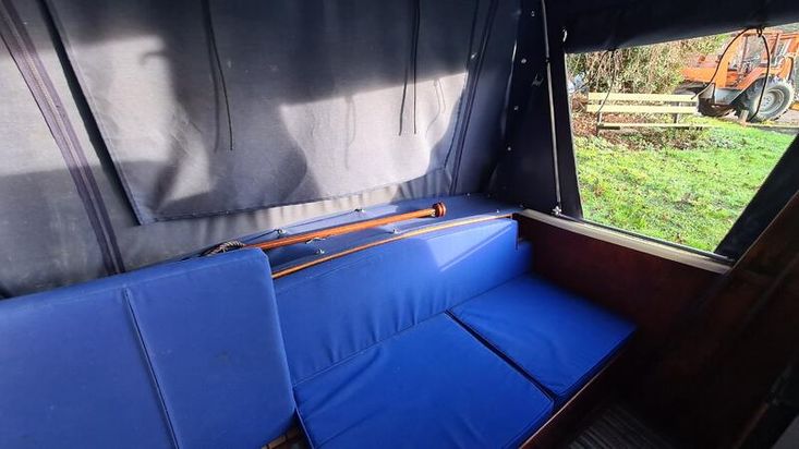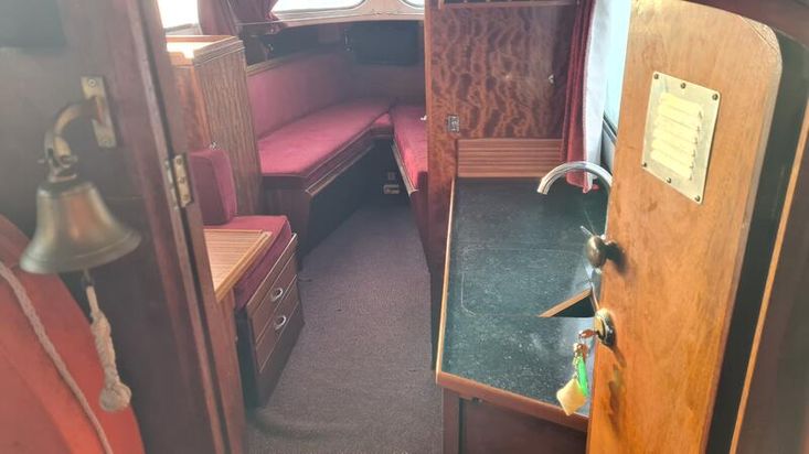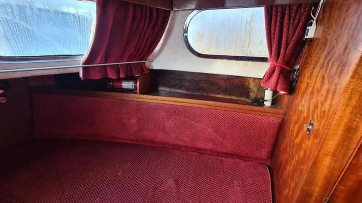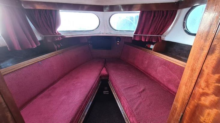 Stepping down into the cabin, is the galley with a new worktop and underneath is a stainless steel sink and a 2 burner hob, grill and oven. There is a good size heads. Nice curtains and matching upholstery. Double V berth to the front and on the portside is a pull out double bed with good size wardrobe and shelves and a table for dining. There is a good amount of storage in the cabin, wired in solar panel, diesel heating, hot and cold water and shore power. A new Boat Safety certificate will be in place from January 2026 to run for 4 years.