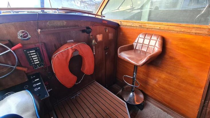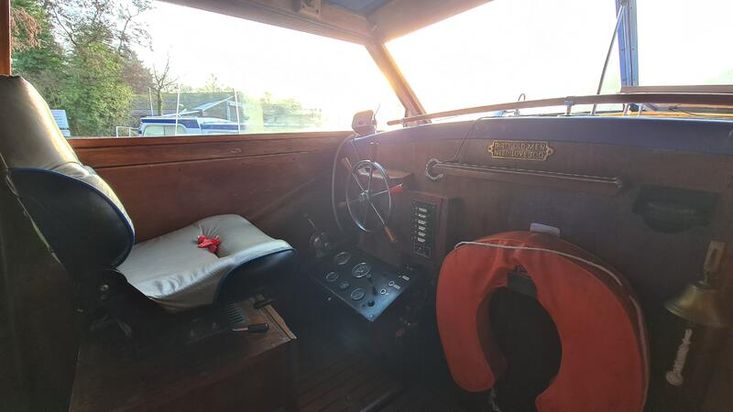 The cockpit seating is in very good condition. Underneath the helm seat is a 12V electric fridge. Nice gauges, a windscreen wiper over the portside and a stereo.