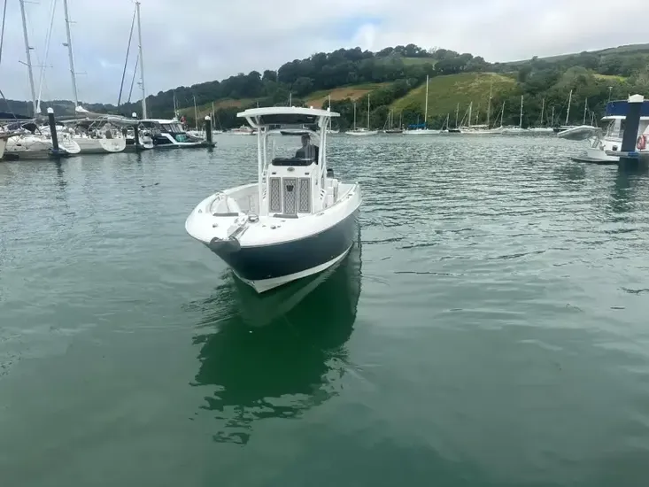 This boat features a Phantom Grey hull with a white T top and black trim, making it visually striking. It is ideal for offshore trips and wake-boarding. The Wellcraft is designed for offshore conditions, handling big waves and choppy waters effortlessly.